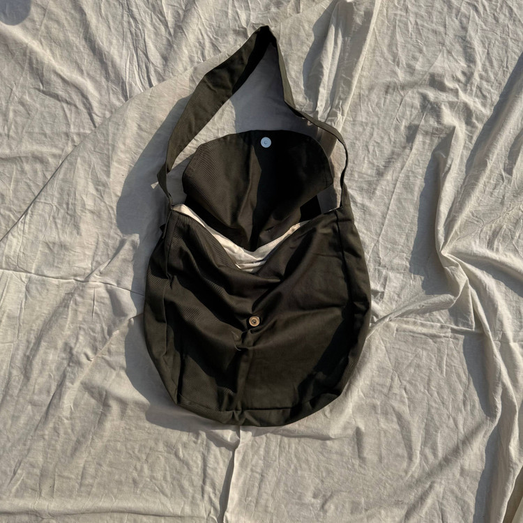 جنس کیف کتونه، قابل شستوشو و بادوام. داخلش آسترکشی شده و دوتا جیب داره (اگه بخوای، میتونیم جیبهای بیشتری هم برات بدوزیم 🧵).